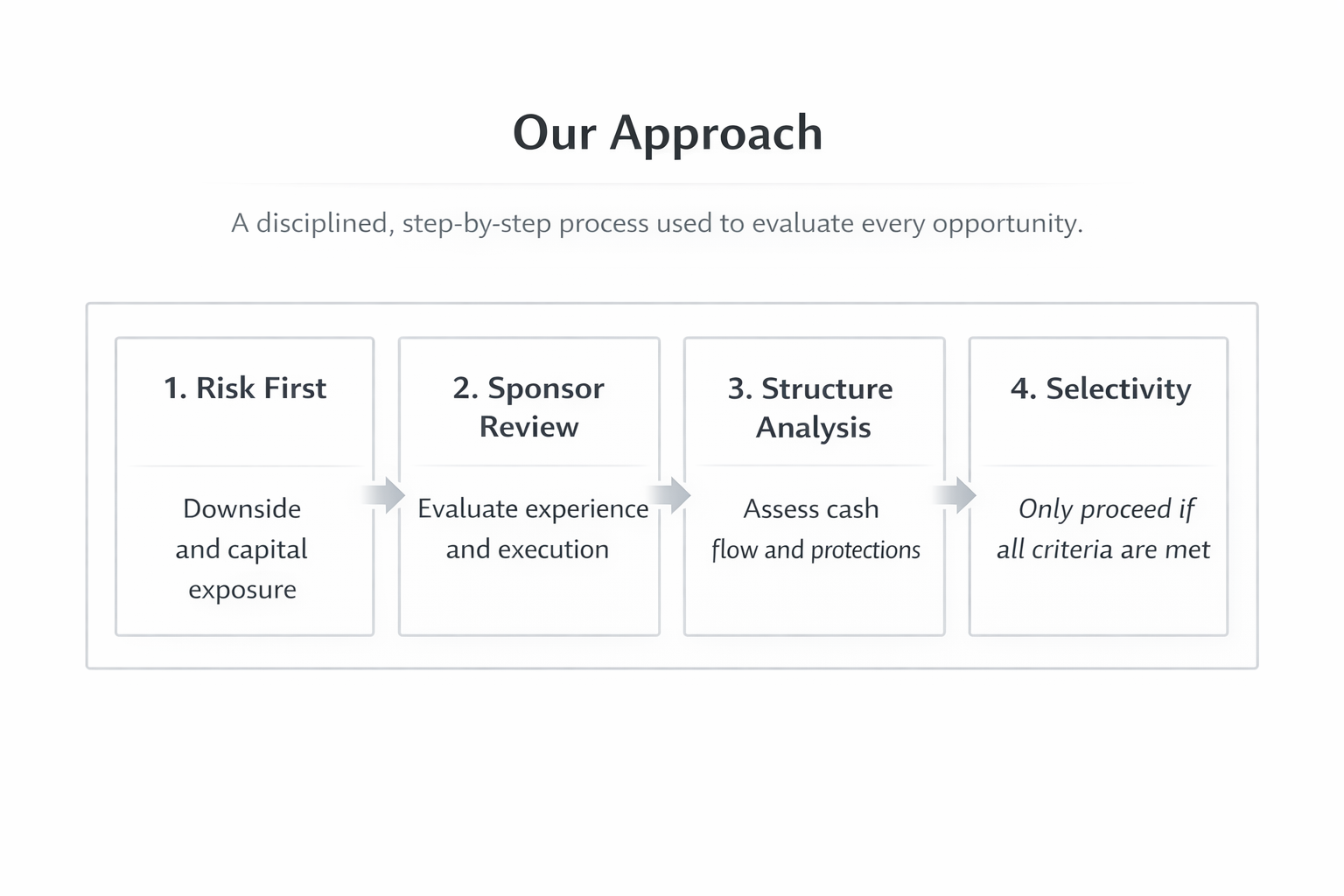 Select private market opportunities designed to prioritize downside protection while still delivering long-term, risk-adjusted returns. We focus on simple structures, experienced operators, and investments that hold up across market cycles.